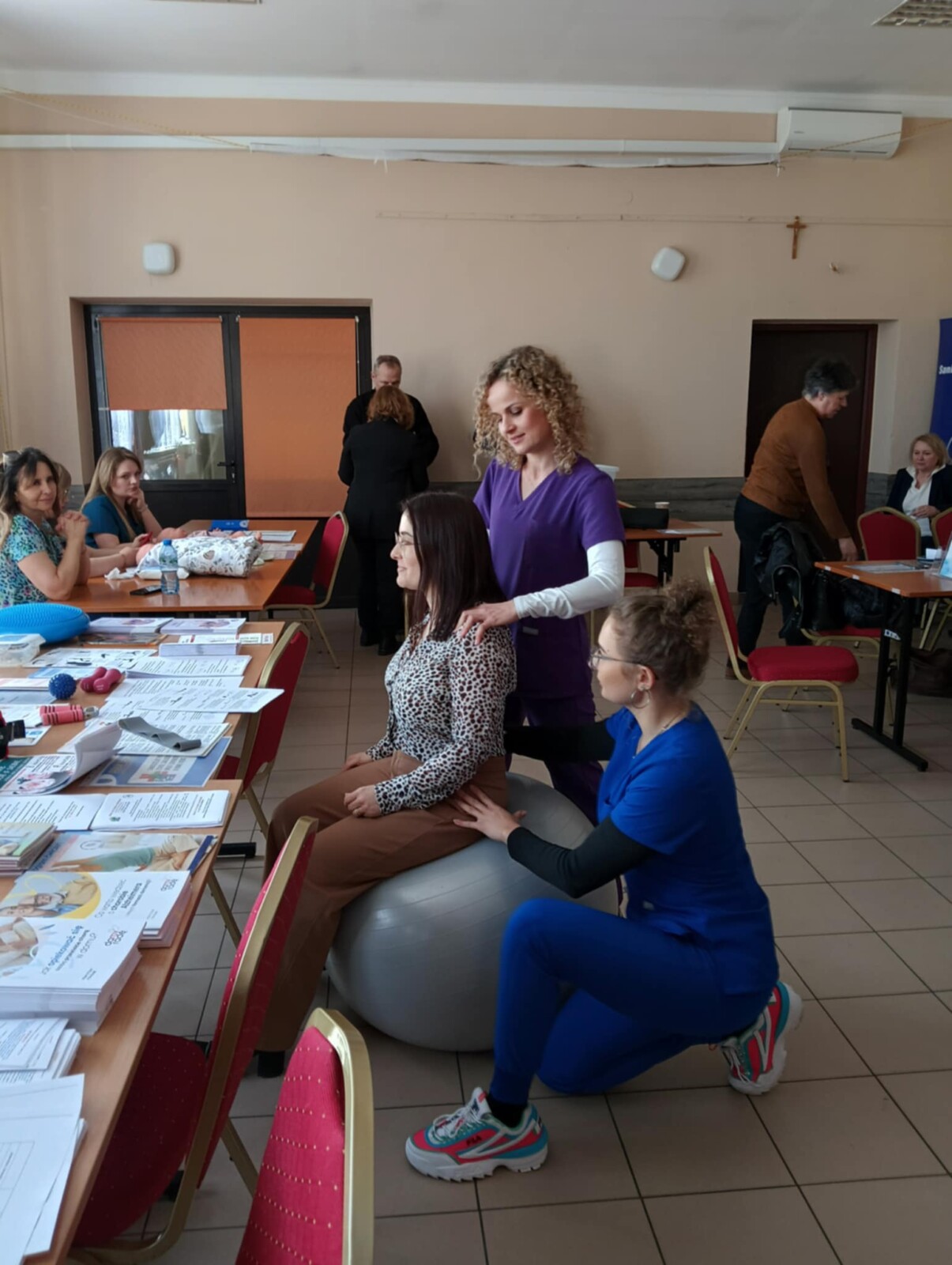 Panie Dominika Zielińska i Katarzyna Marek, fizjoterapeutki z Oddziału Rehabilitacji, prezentowały możliwości wykonywania samodzielnych ćwiczeń w celu zachowania zdrowego kręgosłupa na wszystkich jego odcinkach, ćwiczenia na koślawość kolan i ćwiczenia usprawniające stawy biodrowe.