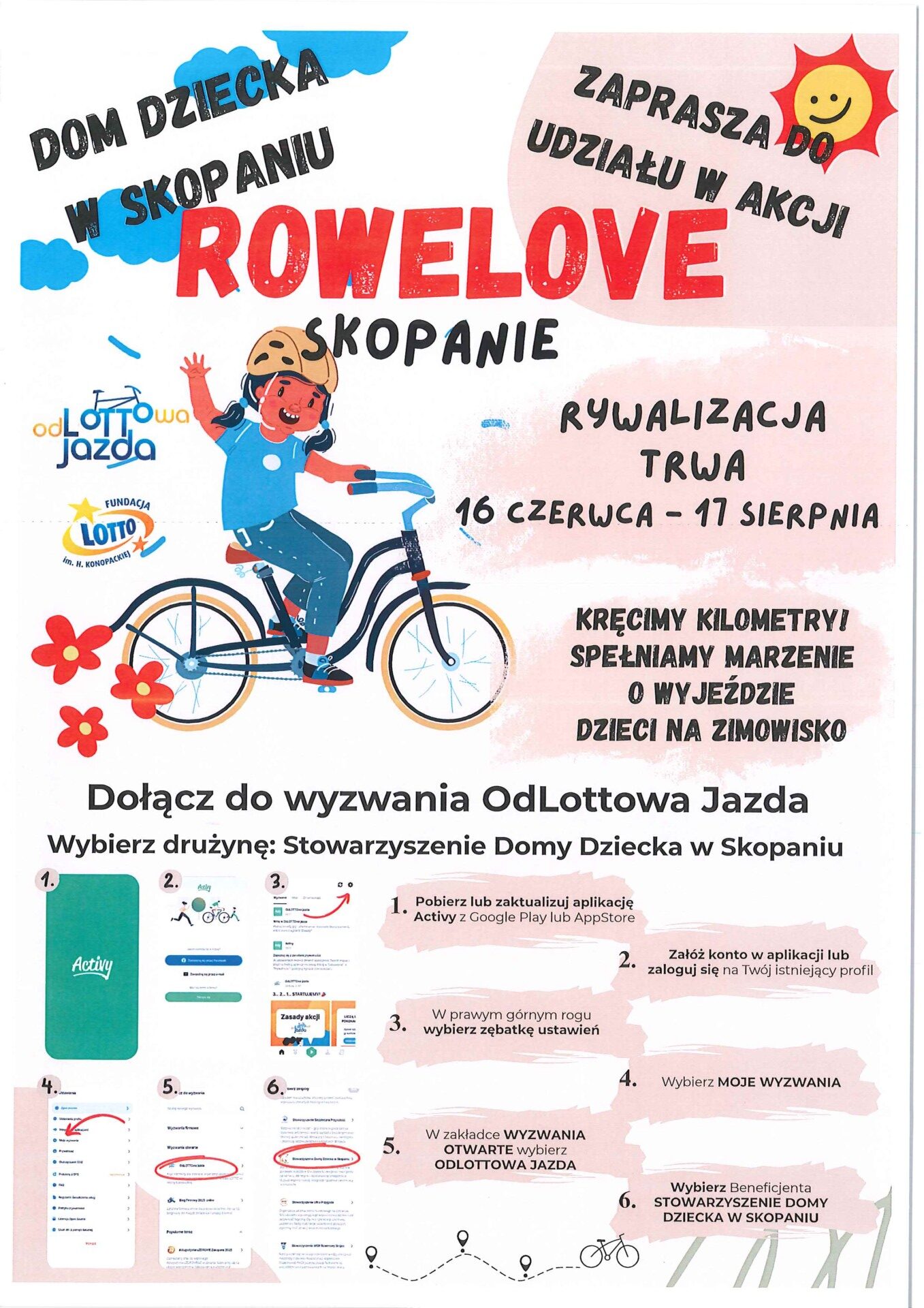 Od 16 czerwca do 17 sierpnia br. trwa akcja „ROWELOVE Skopanie” mająca na celu uzbieranie kilometrów poprzez jazdę na rowerze. Podopieczni z Domu Dziecka chcą w ten sposób uzbierane fundusze przeznaczyć na wyjazd podczas ferii zimowych.